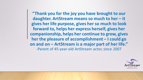 "ArtStream has helped boost my self-confidence in ways I never thought possible. It has helped me make wonderful friends, a task I’ve never been very good at. It has allowed me to sing and dance and speak in front of an audience,” said a 30-year-old ArtStream actor of the difference ArtStream has made in his life. The FCIDD’s support guaranteed the success of ArtStream’s new world of hybrid programs and rehearsals, which were created and expanded on a wing and a prayer during the successive waves of isolation and social distancing required by the COVID pandemic. Thanks to the FCIDD’s support, more individuals can access ArtStream’s classes, workshops, and theatrical games that require them to engage, communicate, collaborate, make eye contact, think on their feet, make connections, synthesize information, and solve problems. ArtStream’s demanding and very entertaining process encourages ArtStreamers to discover their creativity and strengths, and perform with confidence.